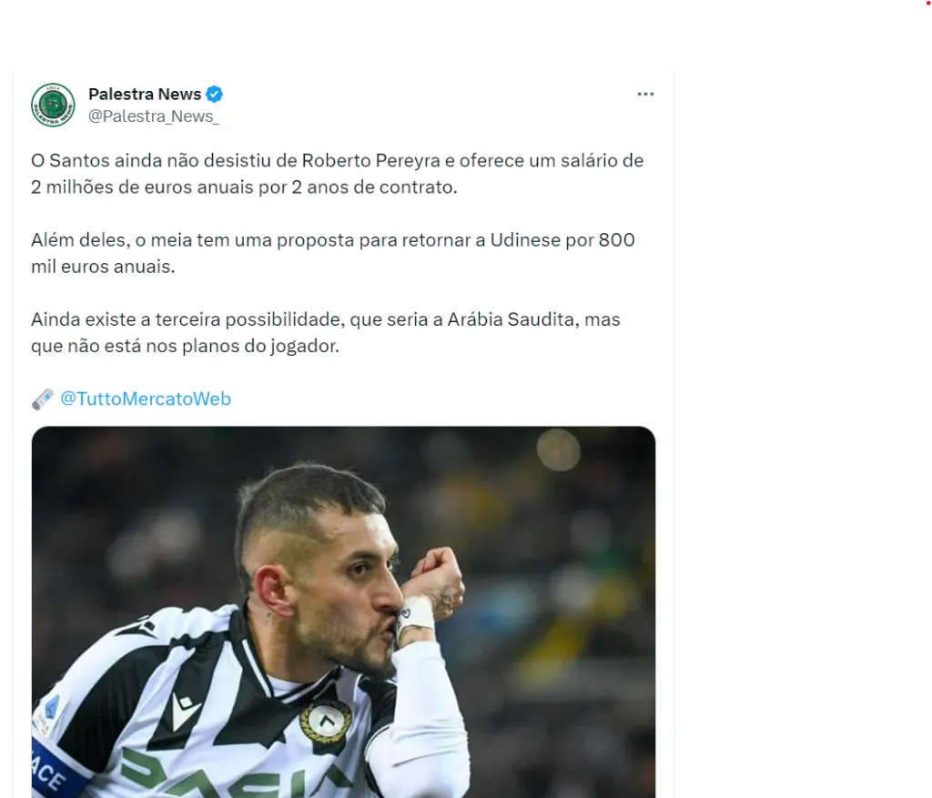 De acordo com informações da mídia italiana (Tuttomercato), o Santos fez mais uma oferta por Roberto Pereyra: 2 milhões de euros por temporada (cerca de R$ 850 mil por mês) e um contrato de duas temporadas. O Peixe aguarda a resposta do argentino.