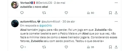 “Esse Zubeldía é o próximo Abel Ferreira, é um fenômeno. O António Oliveira chegou, e em um jogo vocês falaram que era um fenômeno, porque eu não posso? Ele não é só o ‘novo Abel’, como é melhor do que o Abel”, avaliou o comentarista.
