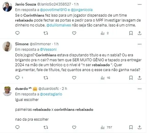Inicialmente cético em relação ao desempenho do Corinthians e prevendo o rebaixamento do rival, Cicinho teve que reconsiderar suas expectativas após a impressionante vitória sobre o Grêmio. “Não cai mais, infelizmente não”, declarou o comentarista, indicando que a permanência na Série A de 2024 parece garantida”.