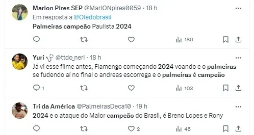 Campeão do Paulistão, da Supercopa do Brasil e do Brasileirão em 2023, a equipe de Abel Ferreira entra na temporada como favorito para conquistar mais títulos. No entanto, Cicinho não compartilha do otimismo e afirmou que o Palmeiras “não vai ganhar nada”.