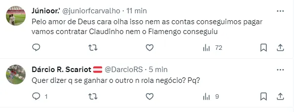 É bem verdade que a contratação de Claudinho é sonho antigo da diretoria do Flamengo. O clube já havia tentando em outras janelas e segue interessado no jogador.