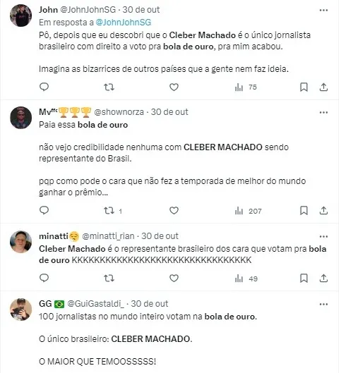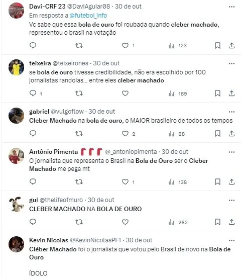 Na eleição de Cleber Machado, Messi ficou no topo, seguido por Haaland, Mbappé e De Bruyne, que completaram o top 4. Vinícius Jr., o único brasileiro entre os 30 nomeados, ficou na sexta posição na votação de Cleber Machado.