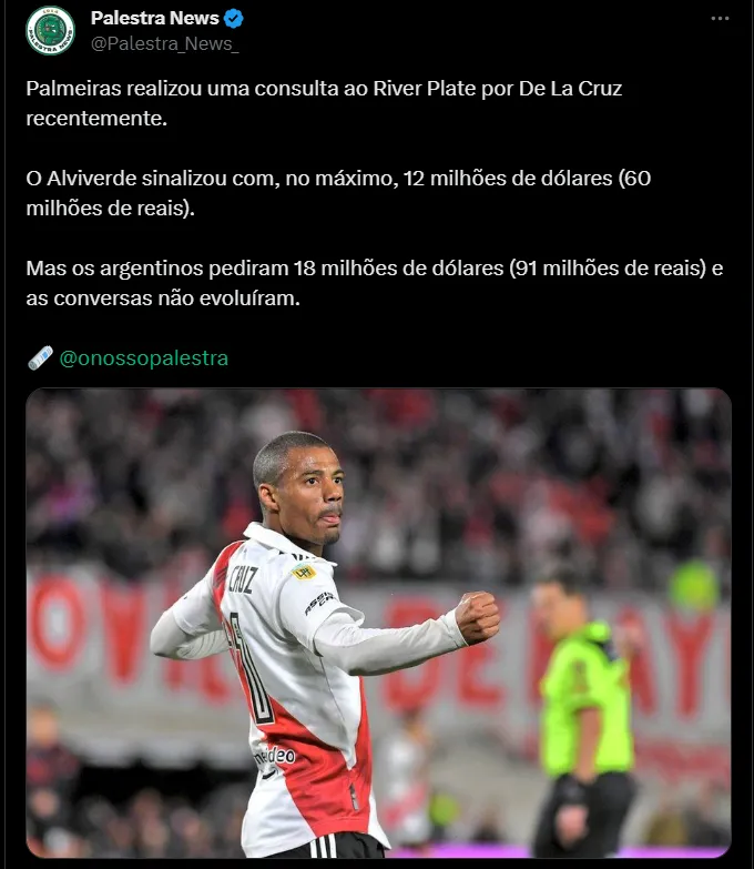 De acordo com as informações publicadas pelo portal “Nosso Palestra”, o Palmeiras está interessado na contratação de Nicolás de la Cruz para a próxima temporada.