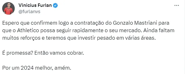 Desta forma, o atleta será peça importante para o time de Curitiba na próxima Copa Sul-Americana. De momento, chega para a vaga de Vitor Roque, negociado com o Barcelona.