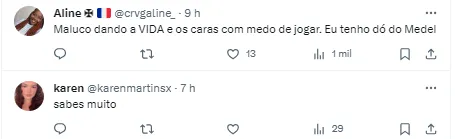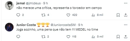 A torcida se manifestou sobre a postura do jogador: “Não merece uma crítica, representa o torcedor em campo” , “Joga sozinho, pena que não tem 11 MEDEL no time”, ‘Maluco dando a VIDA e os caras com medo de jogar. Eu tenho dó do Medel” , outros criticaram: “Disse o jogador que puxa o time todo para jogar recuado. Só reparar nos jogos com e sem ele, como o time joga diferente. Hoje nem era para estar em campo” , Falar isso depois que acaba o jogo é fácil tb né amigão. Todo jogo a mesma m*”