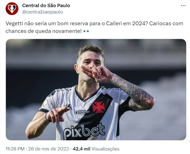 “Vegetti não seria um bom reserva para Calleri em 2024? Cariocas com chances de queda novamente!”, diz um portal de notícias voltado para o São Paulo.