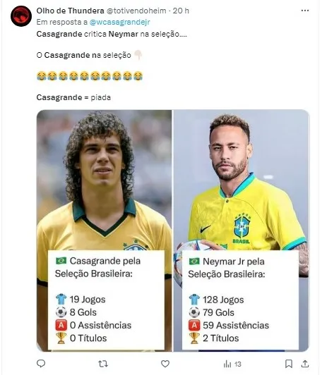 “De todos que já vi? Pelé, Rivellino, Zico, Falcão e o Sócrates, dos antigos.”, respondeu o ex-jogador e comentarista Casagrande.