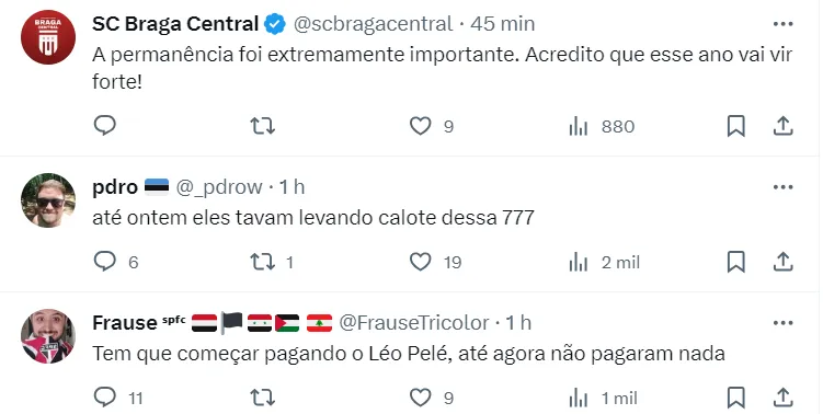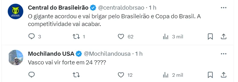 “Paulo Bracks foi demitido, mas a mania do Vasco de buscar jogadores no Santos vai continuar. O scout do Cruz-Maltino avalia dois nomes do rebaixado Santos: Joaquim e Jean Lucas. Tudo embrionário ainda… Informei”, disse a fonte.