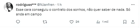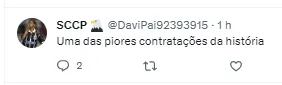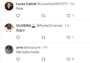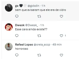 “Para os especialistas daqui do Twitter esse ai era o Pelé paraguaio… “ ,“Em 2024 ele vai mostrar o seu futebol” , “Se o time é uma m* e ele era destaque no time anterior, daria mais chances para ele” , “Eu fico (com ele)” , “Creio que dá para encaixar, mas na minha opinião não vale a pena o esforço, rua”, “Não tem segredo com esse, é RUA E ACABOU (…)” , “Fora” , “Bagre” , “Me iludi muito”, publicaram alguns torcedores no Twitter.