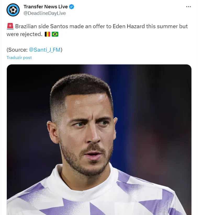 Com o projeto do Santos na mesa, Eden Hazard não tem interesse em jogar no futebol brasileiro. A fonte não fornece maiores informações, mas destaca que o belga recusou a possibilidade de assinar com o gigante paulista.