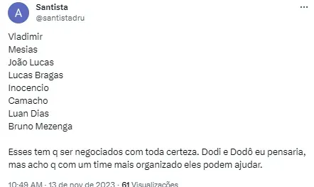 Gabriel Inocêncio tem chances de expectativa de permanecer no clube, segundo o ge. Ele desembarcou em Santos e conseguiu uma sequência de 11 jogos como titular, mas caiu de desempenho e perdeu espaço na equipe. Até aqui participou de 22 jogos. Ele é reserva de Kevyson pelo lado esquerdo e voltou a entrar em campo após nove jogos. Ele tem se mostrado peça útil e espera o final da temporada para saber a definição sobre seu futuro.