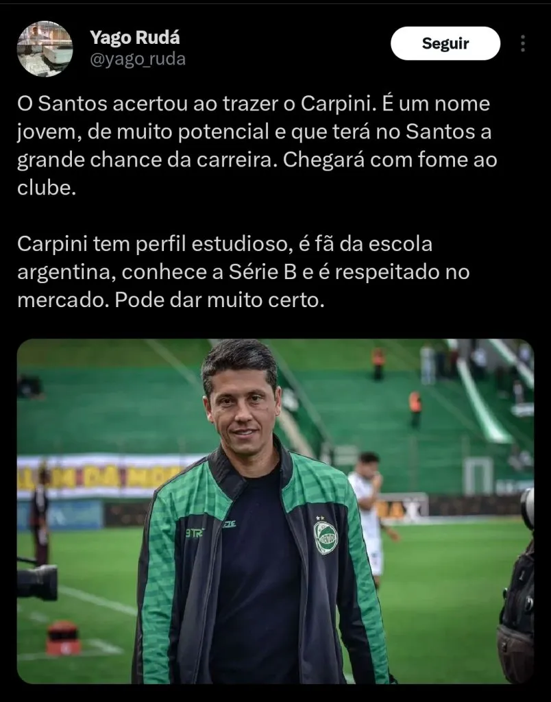 O GE reporta na noite desta terça-feira que o Santos conseguiu chegar a um acordo com o técnico Thiago Carpini para assumir o comando da equipe.