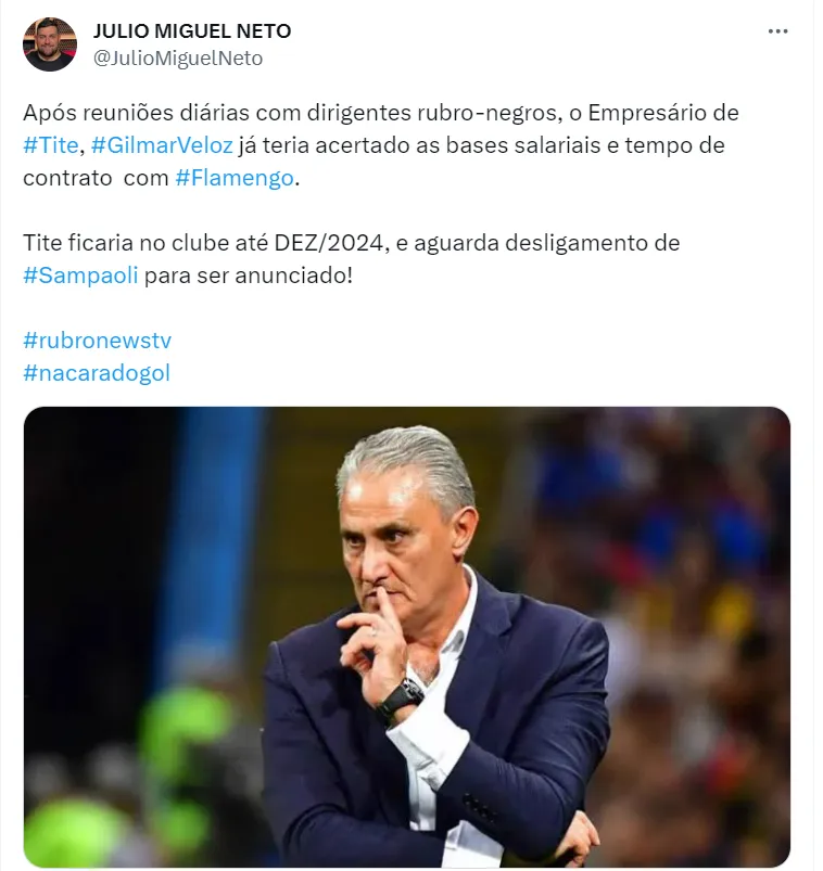 Alvo do Al Hilal, o empresário responsável pela carreira de Tite, Gilmar Veloz, já acertou os termos salariais e o tempo de contrato com o Flamengo, conforme informado por Julio Miguel Neto. A fonte não entra em detalhes sobre o salário do treinador, mas informa que Tite terá um contrato até dezembro de 2024.
