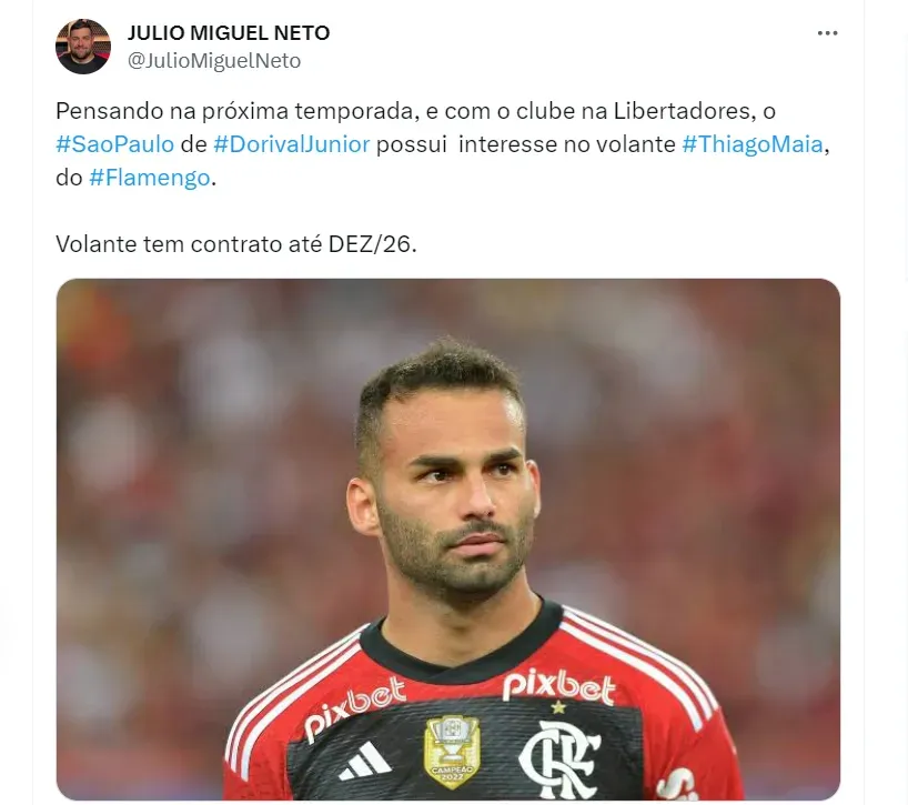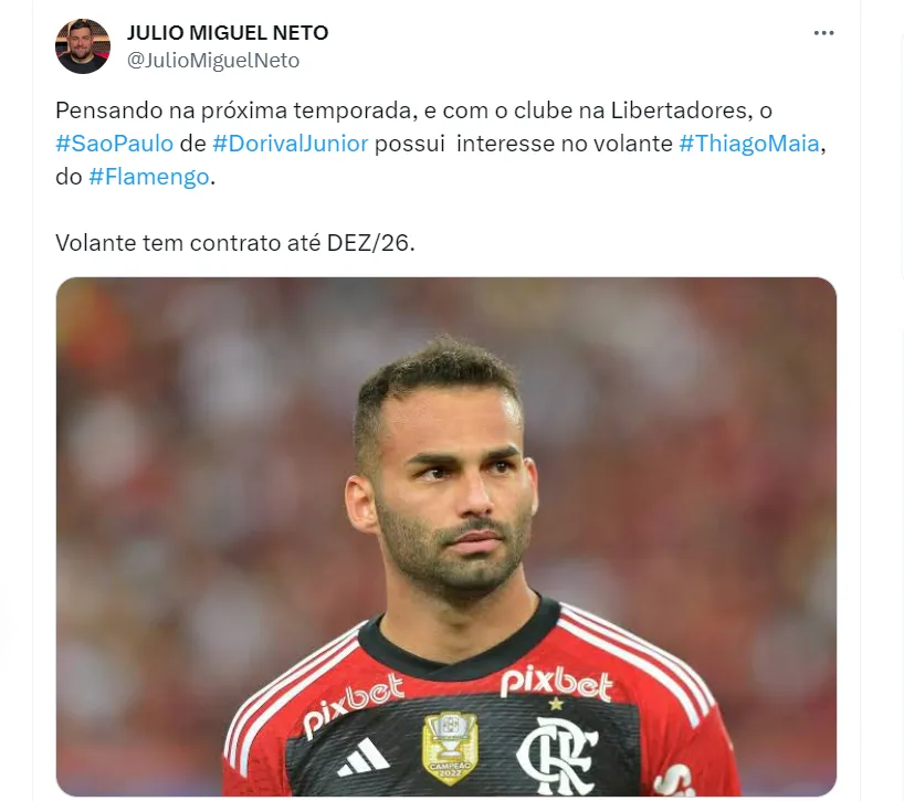 O jornalista Julio Miguel Neto informa que Thiago Maia é alvo do São Paulo para o ano de 2024. Ele relata que o clube, visando a Copa Libertadores, está de olho no jogador do Mengão, com quem trabalhou sob o comando de Dorival Jr em 2022.