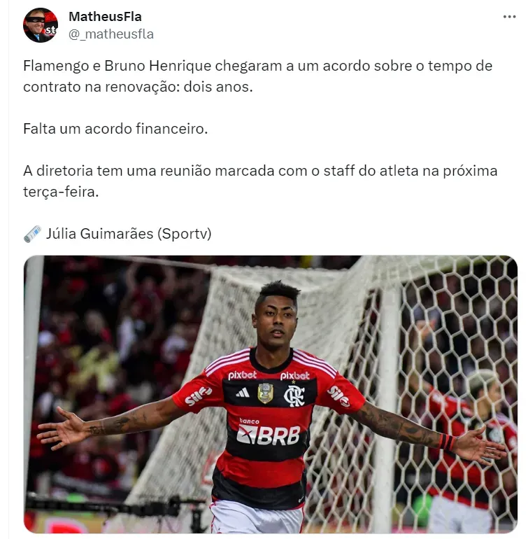 No entanto, o futuro de Bruno Henrique deverá ser, de fato, a permanência no Flamengo. Segundo Júlia Guimarães, o Flamengo e o jogador chegaram a um acordo sobre a duração da renovação do contrato, que será de dois anos. Agora, resta apenas selar o acordo financeiro.