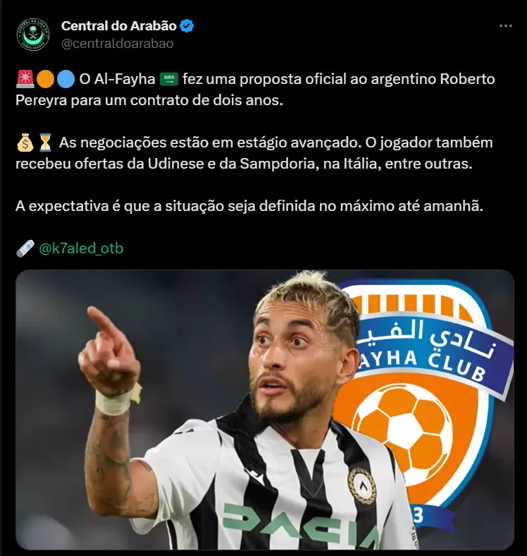 Isso porque Roberto está em negociações avançadas com o Al-Fayha, da Arábia Saudita. De acordo com as informações publicadas pelo jornalista Khaled Al Rasheed, o clube saudita já enviou uma oferta oficial.