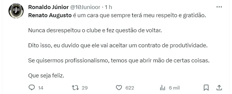 De acordo com o UOL Esporte, a ideia do Corinthians é oferecer um contrato de produtividade para ter Renato Augusto no ano de 2024. Dessa forma, o jogador só permanecerá no clube, caso aceite esse novo contrato.