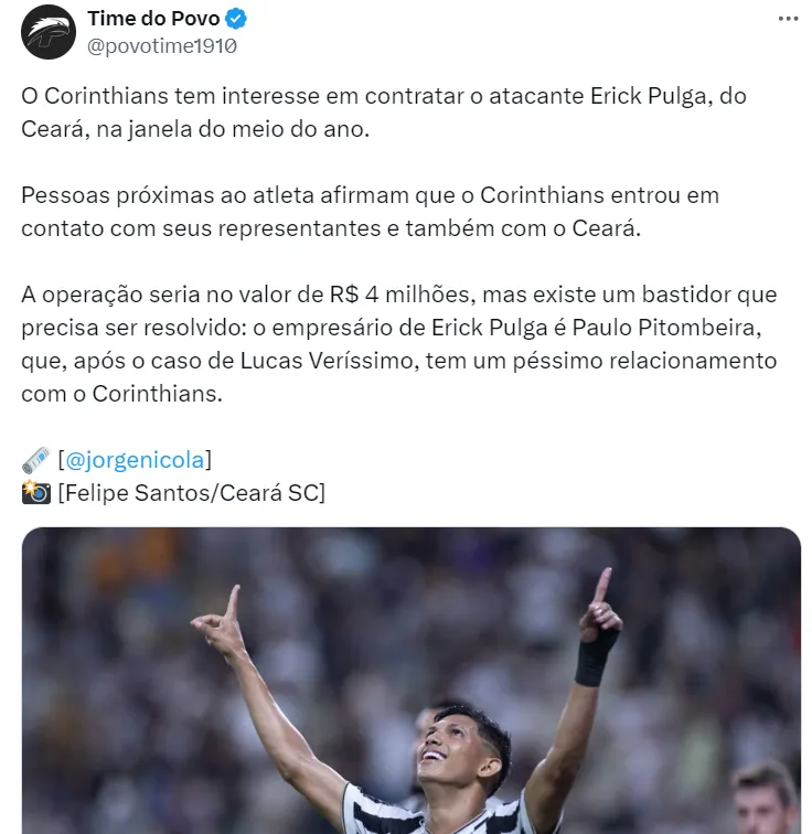 O Corinthians abriu os primeiros contatos pela contratação do atacante Erick Pulga, de 23 anos de idade, que faz grande temporada de 2024 com as cores do Ceará, conforme informações de Jorge Nicola.