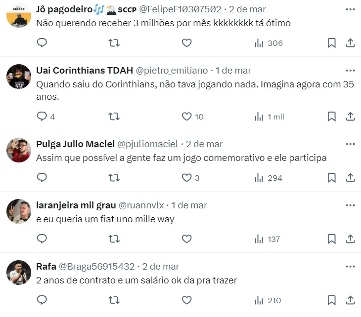 No momento, não há informações sobre jogadores que o Corinthians está negociando neste momento, mas existe as oportunidades de mercado, além dos rumores.