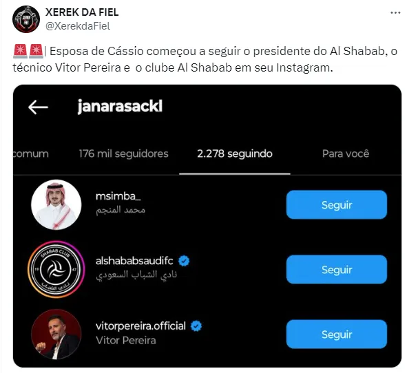 A mulher seguiu, por exemplo, perfis árabes, além do técnico Vítor Pereira e a conta oficial da equipe saudita, que busca um novo goleiro desde a última janela de transferências do país.