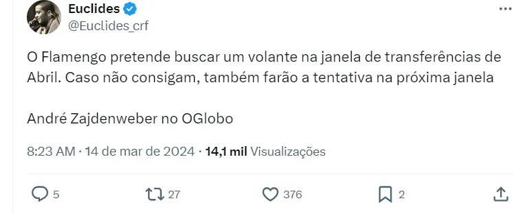 A decisão sobre a contratação do jogador português como reforço do Flamengo está nas mãos do Tite. O nome foi passado para o clube carioca, que passou para o treinador do Mengão.