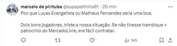 Ainda assim, Augusto Melo segue trabalhando. De acordo com o jornalista Thiago Fernandes, o Corinthians tem interesse no meio-campista Matheus Fernandes, do RB Bragantino.