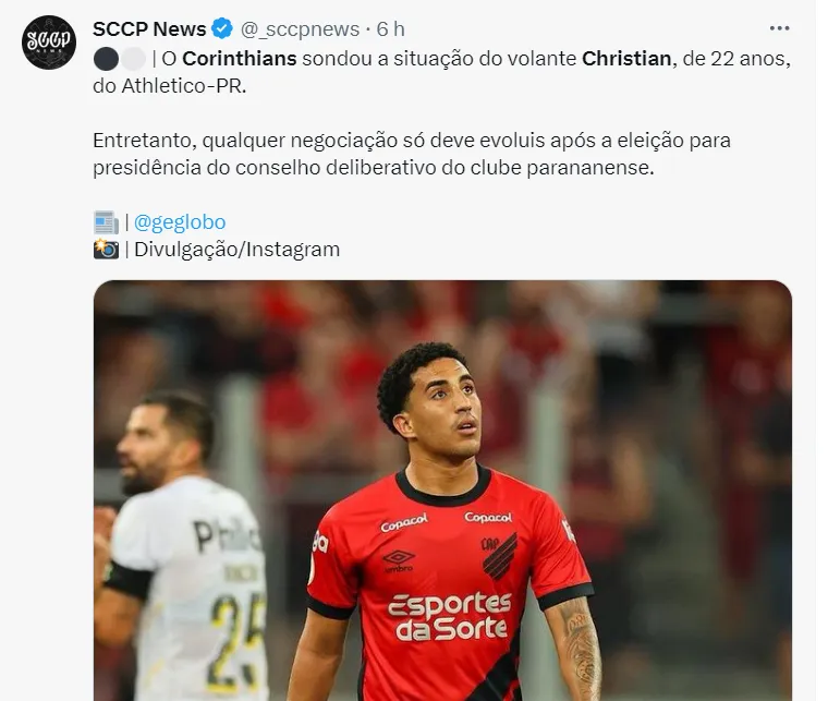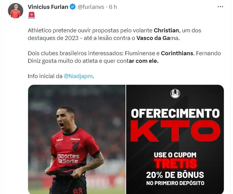 O volante Christian, de apenas 22 anos de idade, destaque do Athletico-PR, é alvo de Corinthians e Fluminense para o ano de 2024, e pode deixar o Rubro-Negro no fim do ano.