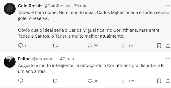 O Corinthians está no mercado em busca de um goleiro para substituir Carlos Miguel, que vai jogar na Premier League, possivelmente com a camisa do Forest. Há confiança em Donelli, mas o entendimento é que precisa de mais.