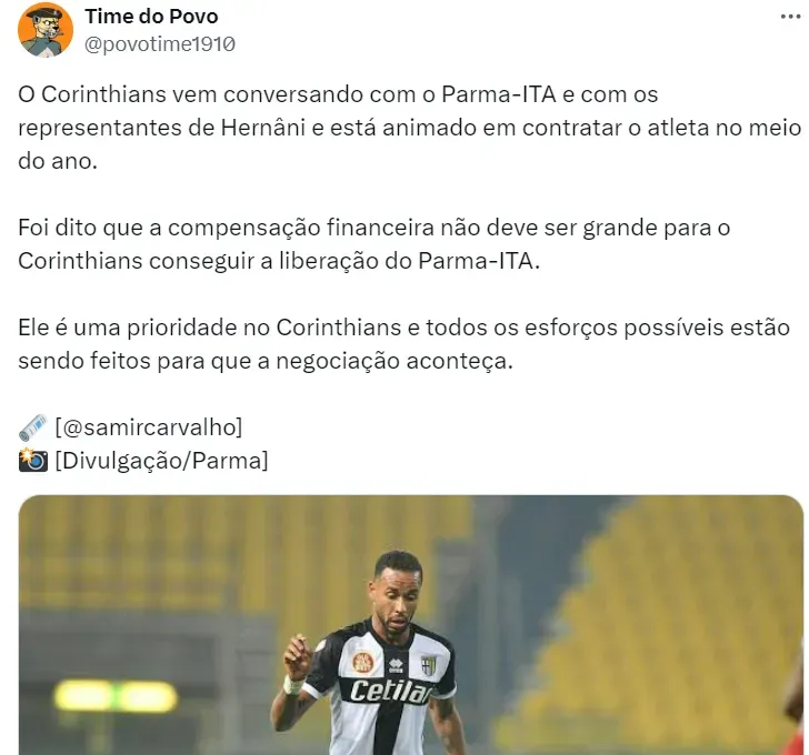 O volante Hernani tende a chegar no Corinthians a partir do meio de 2024. Ele veste as cores do Parma, atualmente na segunda divisão da Itália, onde tem contrato até o ano de 2025.