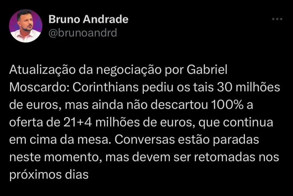 Segundo informações do jornalista Bruno Andrade, o Corinthians aumentou sua pedida por Gabriel Moscardo. O clube paulista pede cerca de 30 milhões de Euros para liberar o jogador.