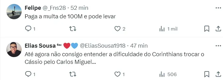 Carlos Miguel tem contrato com o Timão válido até o ano de 2025 e, atualmente, encontra-se apenas na reserva de Cássio, que vem sendo bastante criticado pela imprensa e, sobretudo, pela torcida paulista.