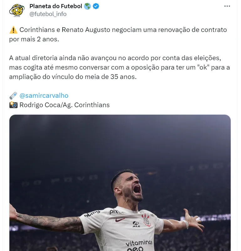 Samir Carvalho informa que Corinthians e Renato Augusto conversam sobre uma renovação de contrato por mais duas temporadas. Segundo a fonte, a atual diretoria ainda não avançou na renovação do meia devido às eleições, mas está estudando dialogar com a oposição para obter um ‘sim’ do jogador para a renovação do contrato.