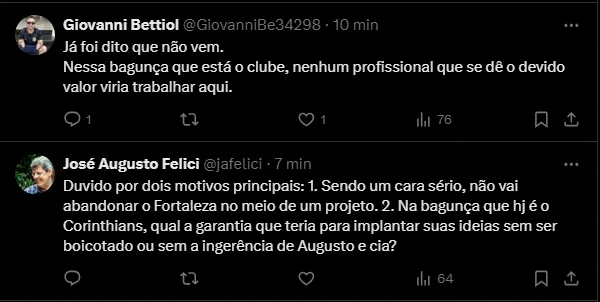 Isso porque Marcelo Paz, CEO do Fortaleza, foi procurado pelo Corinthians nos últimos dias. No entanto, o profissional recusou a proposta e optou por permanecer no clube cearense.