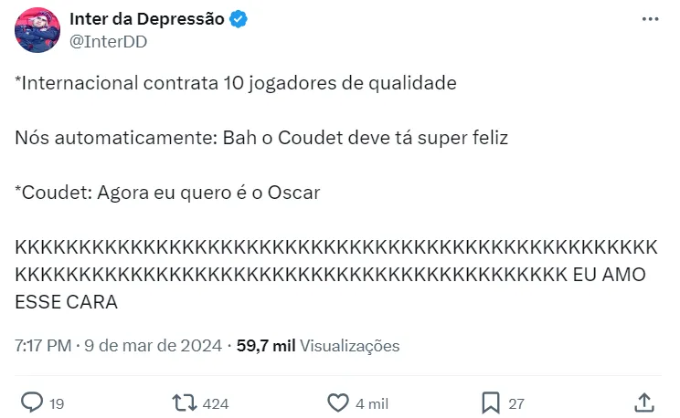 Além de revelar o interesse Colorado no futebol de Oscar, Coudet aproveitou para citar que, apesar do time super forte que a diretoria montou, o Internacional ainda está atrás de Flamengo e Palmeiras.