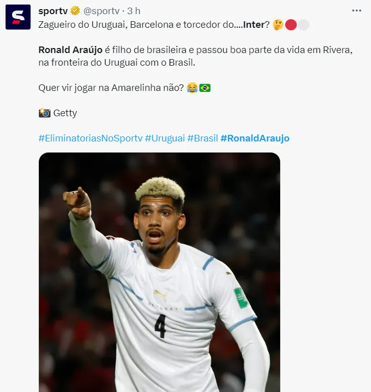 Considerado um dos melhores zagueiros do futebol europeu, Ronald Araújo é torcedor de um grande clube do futebol brasileiro, conforme informa o Globo Esporte. Araújo é conhecido por ter grandes duelos com Vinícius Júnior, do Real Madrid.