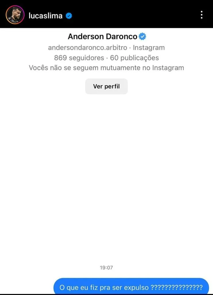 Lucas Lima, que foi expulso da partida após confusão envolvendo o argentino Pablo Vegetti, do Vasco, resolveu enviar uma mensagem na “DM” de Anderson Daronco após a partida.