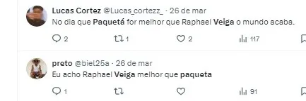 “O Raphael Veiga é melhor que o Lucas Paquetá. Pra mim, ele é melhor. Eu acho que ele é um jogador pra ser reserva, o Veiga deveria jogar mais que ele”, afirmou Neto.