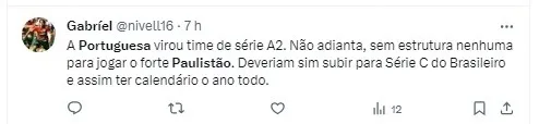 Segundo Neto, a Portuguesa “vai cair”, e dificilmente conseguirá evitar o rebaixamento. O time está em 14º lugar na classificação geral e em terceiro no grupo A, com apenas três pontos conquistados até o momento.