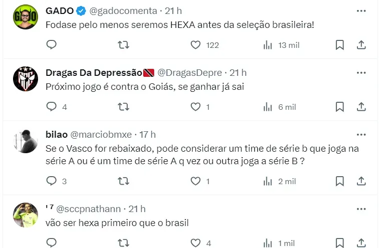 “O Vasco pra mim já caiu com 30 pontos. Se o América caiu, se o Coritiba caiu, e pra mim o Vasco caiu, vai sobrar só mais uma vaga. Do que eu vi ontem… esquece”, disse.