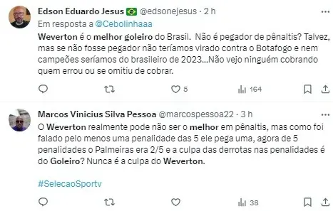 Em meio a essa discussão, a derrota na Supercopa para o São Paulo trouxe à tona algumas críticas em relação ao desempenho de Weverton nas cobranças de pênaltis. Apesar disso, o técnico Abel Ferreira saiu em defesa do goleiro, relembrando a penalidade defendida de Tiquinho Soares, do Botafogo, que foi decisiva para o título brasileiro do Verdão.