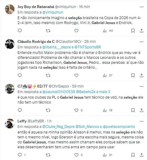 “Se a seleção brasileira fosse do povo, quem você convocaria no lugar do Gabriel Jesus, que nem é relacionado no Arsenal? Por que o Gabriel Jesus está junto com a seleção? Porque a seleção é da CBF. Não é possível que um centroavante que em duas Copas do Mundo não tem um gol marcado”, questionou Neto.