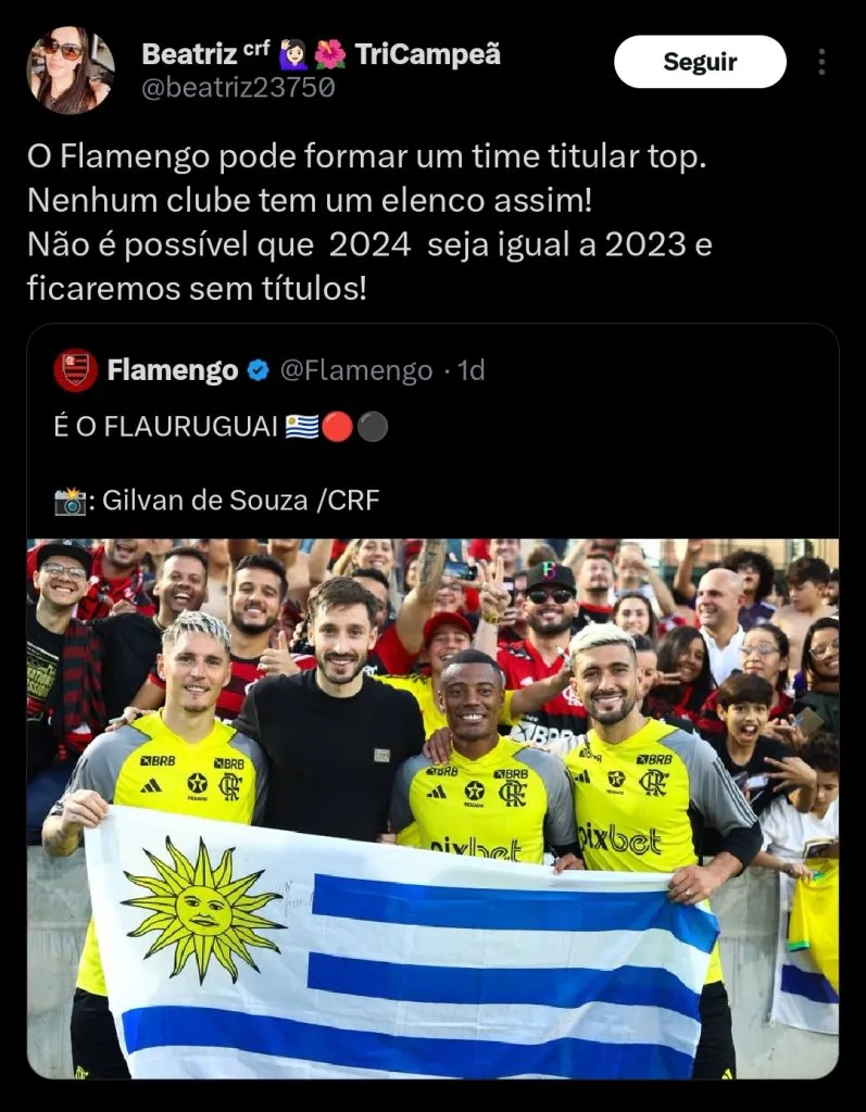 “Tenho certeza que o (Nicolás) De La Cruz vai jogar muito aqui. E o Flamengo contratou o (Mathias) Viña, vai ser duro aguentar o Flamengo, irmão. Vão ganhar tudo“, afirmou o apresentador.