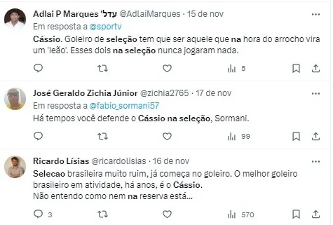Neto expressou sua preferência por Cássio como goleiro da Seleção, afirmando que o jogador do Corinthians é superior aos demais convocados. Mesmo com Alisson, do Liverpool, atuando como titular devido à lesão de Ederson, Neto destacou Cássio como sua escolha ideal. Por outro lado, Velloso e Souza elogiaram Ederson, do Manchester City, como a opção mais adequada.