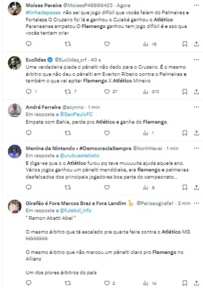 “Mas (o Flamengo) sempre ganha do Atlético Mineiro. Porque os caras quebram o Atlético na arbitragem. Desde antes de Cristo. O que o Flamengo faz com o Atlético (…) Estou dizendo que o Flamengo sempre fez mal para o Atlético na arbitragem. Agora, se fizer de novo, aí tem que parar o campeonato.”, disse Neto.