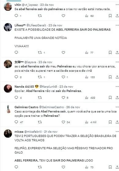 “O Abel Ferreira está mostrando a sua força. E todo mundo está falando que ele vai sair do Palmeiras indo para o Al-Saad, porque é uma grana muito alta, uma fortuna, e eu estou torcendo muito pra isso. Estou fazendo até novela. Pedi até para minha mãe”, comentou.