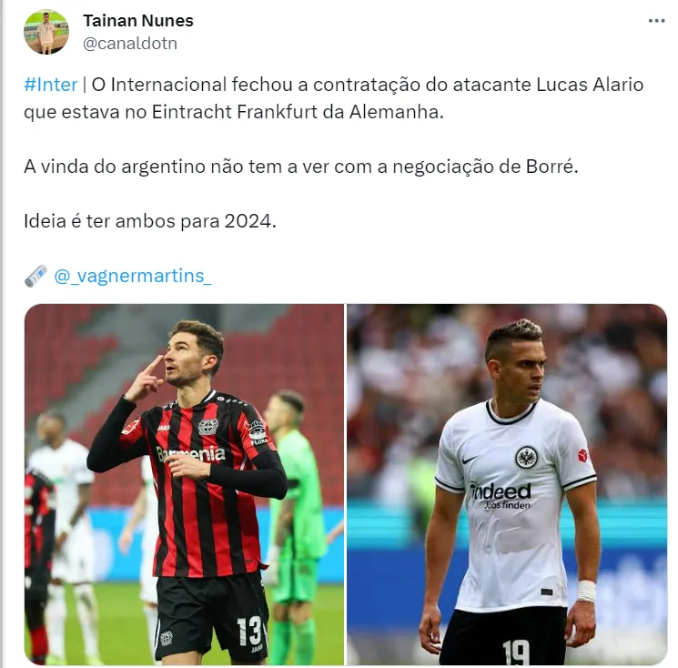 Lucas Alario pertence ao Frankfurt, da Alemanha, clube que ele tem contrato até o ano de 2025. Avaliado em 1,5 milhão de euros, ele não atua há um tempo devido a uma forte lesão, mas chegará ao Inter com bastante moral.