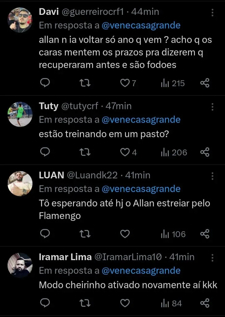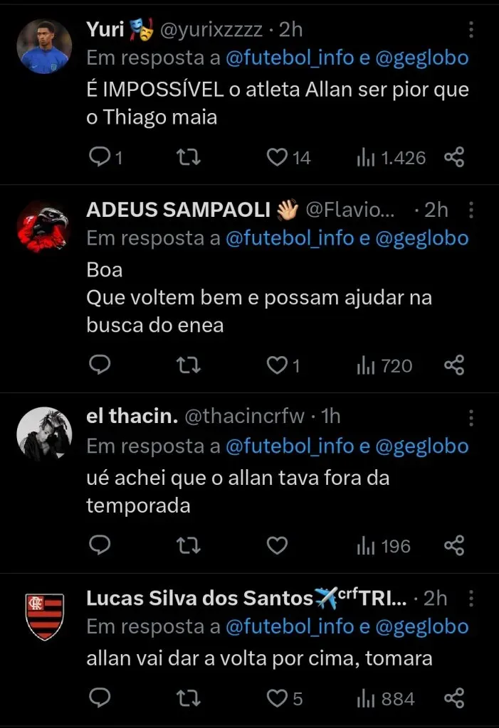 “O Flamengo teve duas boas notícias no treinamento desta terça-feira (14): as voltas de David Luiz e Allan às atividades com o grupo, após recuperação de problemas físicos”, destaca a Coluna do Fla.