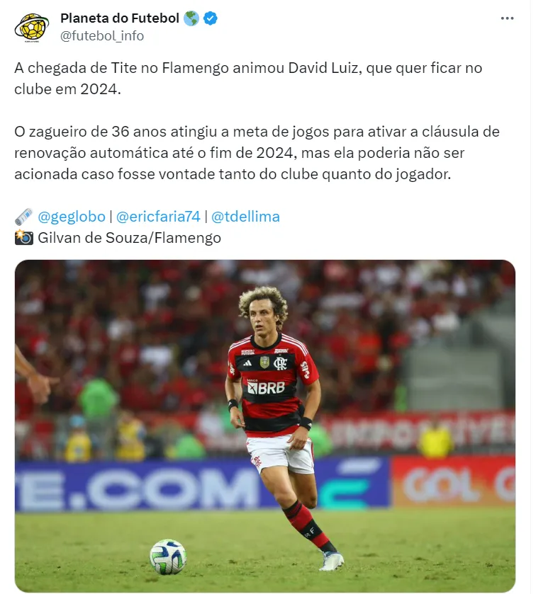 A chegada do técnico Tite ao Flamengo pode influenciar a situação de David Luiz para o ano de 2024. O defensor poderá sair do Mengão ao final da temporada, dependendo da vontade do jogador e do clube. Além disso, o nome do atleta tem sido associado ao Corinthians.