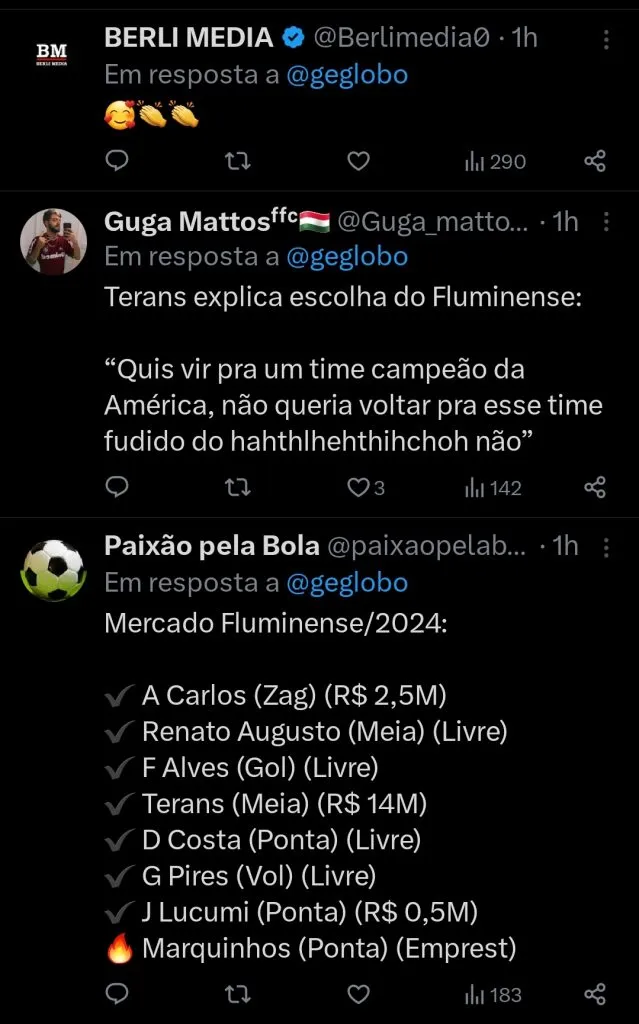 “Eu me adaptei muito bem ao futebol brasileiro. Sei que é muito dinâmico e me sinto bem. Tento me adaptar o mais rápido possível. Vai ser difícil disputar uma vaga, mas vou tentar ajudar o Fluminense a continuar conquistando coisas grandes. Daqui a pouco teremos a Recopa e vamos tentar manter o time conquistando títulos”, frisou Terans.