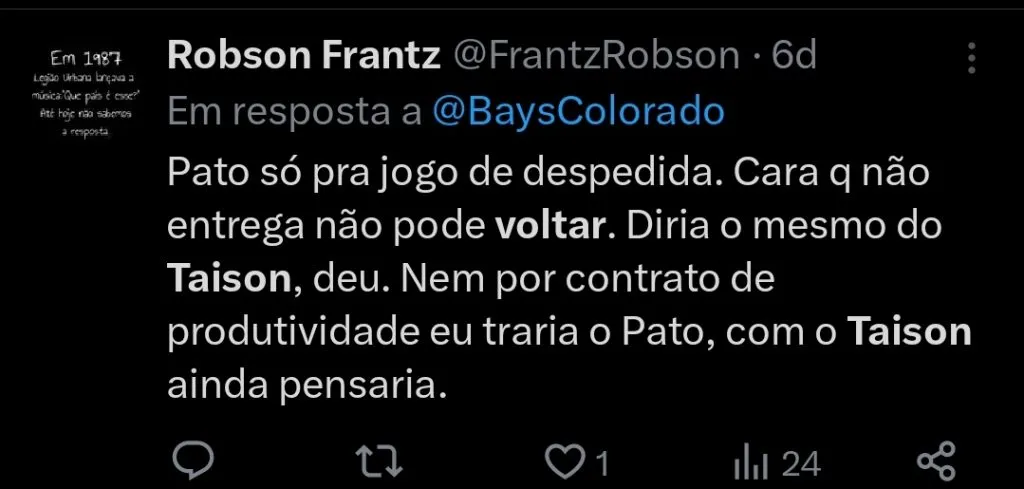 A possibilidade divide opiniões entre a torcida, com parte apoiando o retorno do meia, enquanto outros acreditam que seu ciclo no time já foi encerrado.